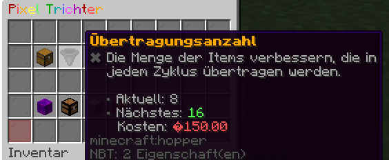 • Der Standard: Ein frisch platzierter Pixeltrichter startet bei 8 Items pro Zyklus (wie im Screenshot zu sehen). Der nächste Schritt hebt das Ganze bereits auf 16 Items an.
