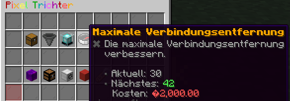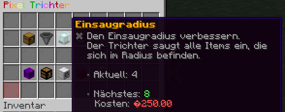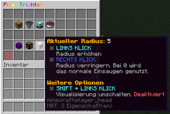 • 🖱️ Rechts-Klick: Verringert den Radius. Wenn du ihn auf 0 stellst, nutzt der Pixeltrichter nur noch das normale Einsaugen (also nur Items, die direkt auf ihm landen).