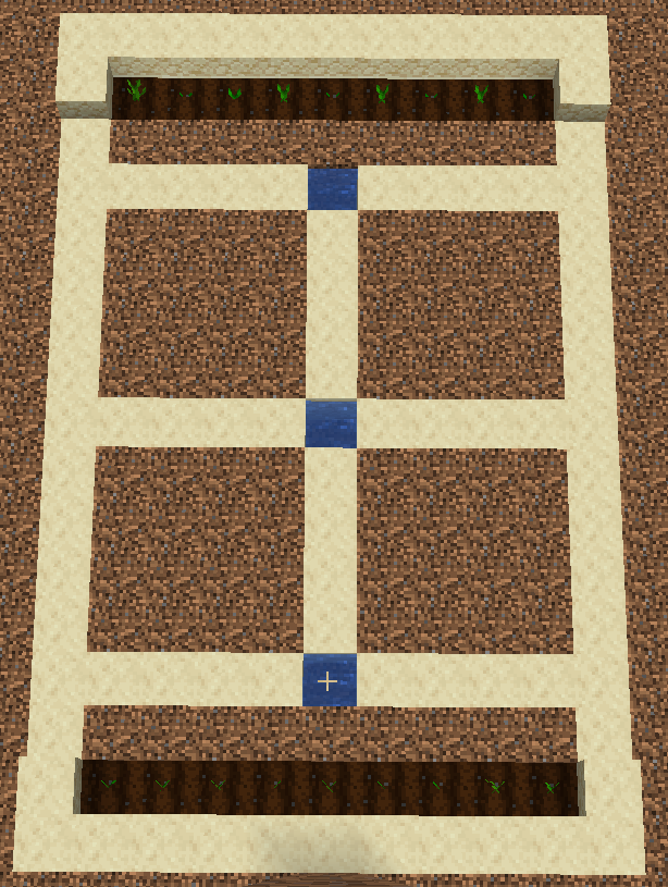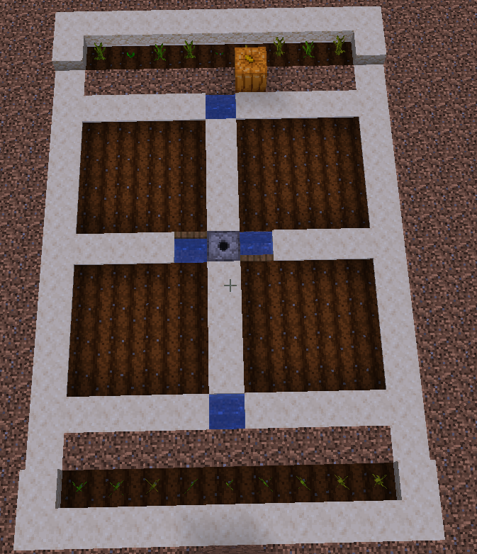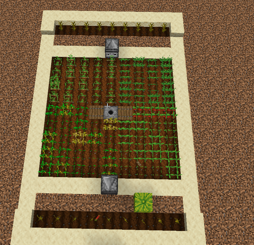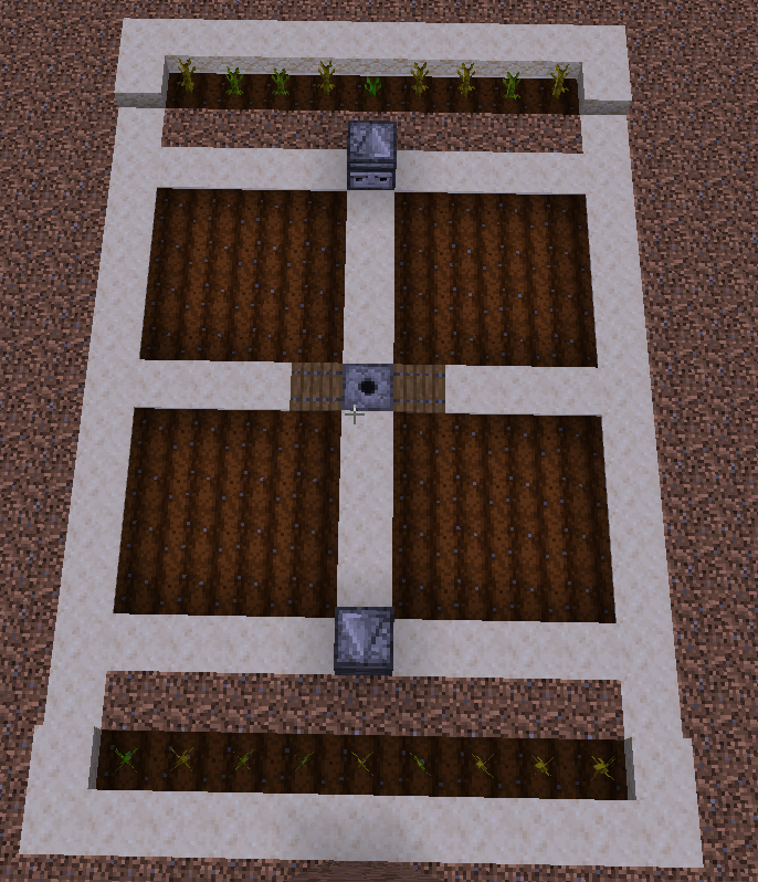 Dieses Bild zeigt einen beispielhaften Aufbau, um das volle Potenzial deines Farmer- und Sprinkler-Systems auszuschöpfen. Da beide Module einen festen Radius von 4×4 Blöcken haben, hilft dieses Design dabei, keinen Platz zu verschwenden.